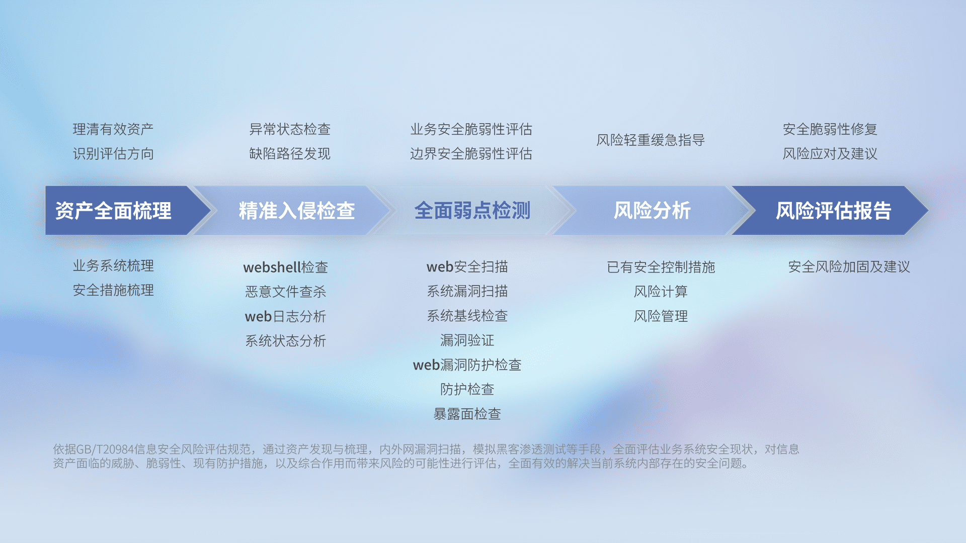针对客户行业特性,,,以专业的安全服务+多厂商联合解决方案提供专属的一站式安全管理服务,,,帮助客户全面感知网络空间威胁,,,,基于识别、、、、检测、、、、分析、、防护、、、监测、、响应的服务理论模型,,从方案咨询、、、、集成交付、、、评估验证、、、、优化加固、、、、运维运营,,,,致力于为客户提供完整的闭环管理式安全服务。。。。以实战经验为客户打造高抵御风险的安全体系,,,,帮助客户发现威胁、、对抗威胁、、、、处置威胁,,,,不断积累安全对抗能力,,,持续保障数字化安全。。
